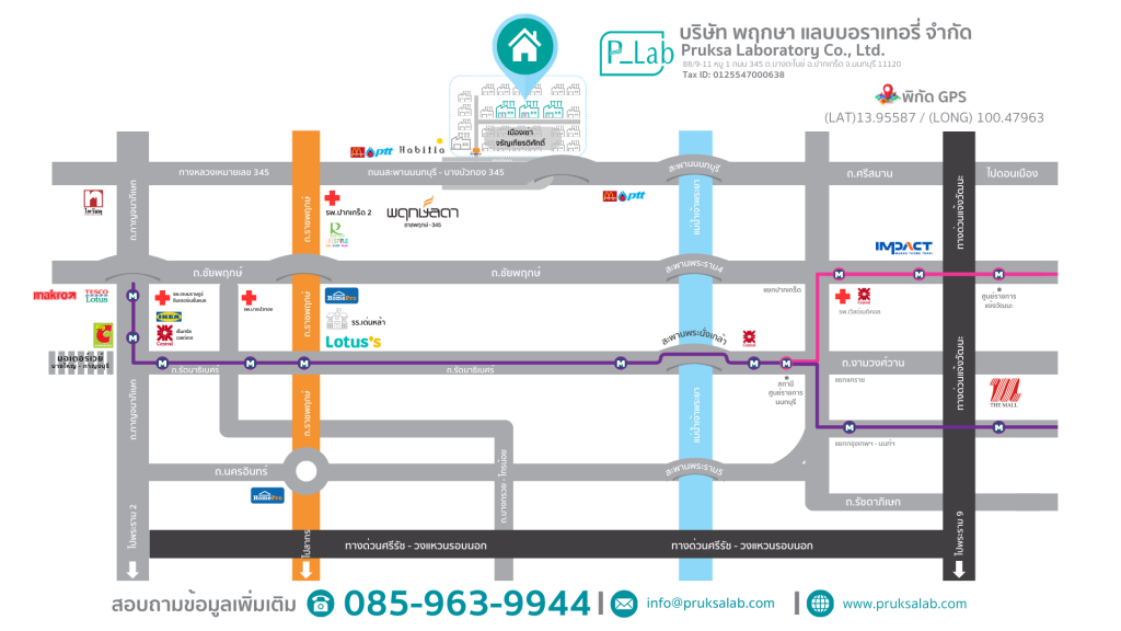 บริษัท พฤกษา แลบบอราเทอรี่ จำกัด 88/9,88/10,88/11 หมู่ 1 ถนน 345 ตำบลบางตะไนย์ อำเภอปากเกร็ด จังหวัดนนทบุรี 11120 ประเทศไทย