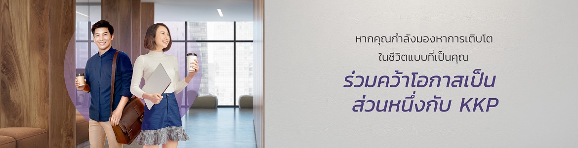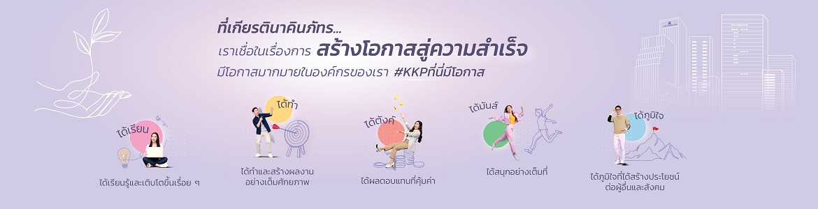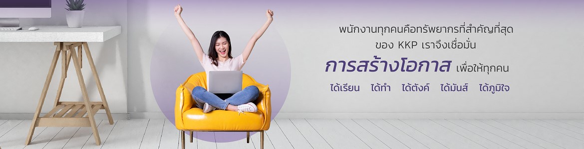 ที่ KKP เราเชื่อในเรื่องการสร้างโอกาสสู่ความสำเร็จ มีโอกาสมากมายในองค์กรเรา มีพื้นที่ให้คุณได้เรียนรู้และเติบโต ได้ทำและสร้างผลงานอย่างเต็มศักยภาพ ได้ผลตอบแทนที่คุ้มค่า ได้สนุกอย่างเต็มที่ และได้ภูมิใจที่ได้สร้างประโยชน์ต่อผู้อื่นและสังคม