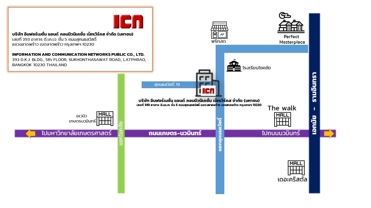 บริษัท อินฟอร์เมชั่น แอนด์ คอมมิวนิเคชั่น เน็ทเวิร์คส จำกัด (มหาชน) อาคาร ดี.เค.เจ ชั้น 5 เลขที่ 393 ถนนสุคนธสวัสดิ์ แขวงลาดพร้าว เขตลาดพร้าว จังหวัดกรุงเทพมหานคร 10230 ประเทศไทย