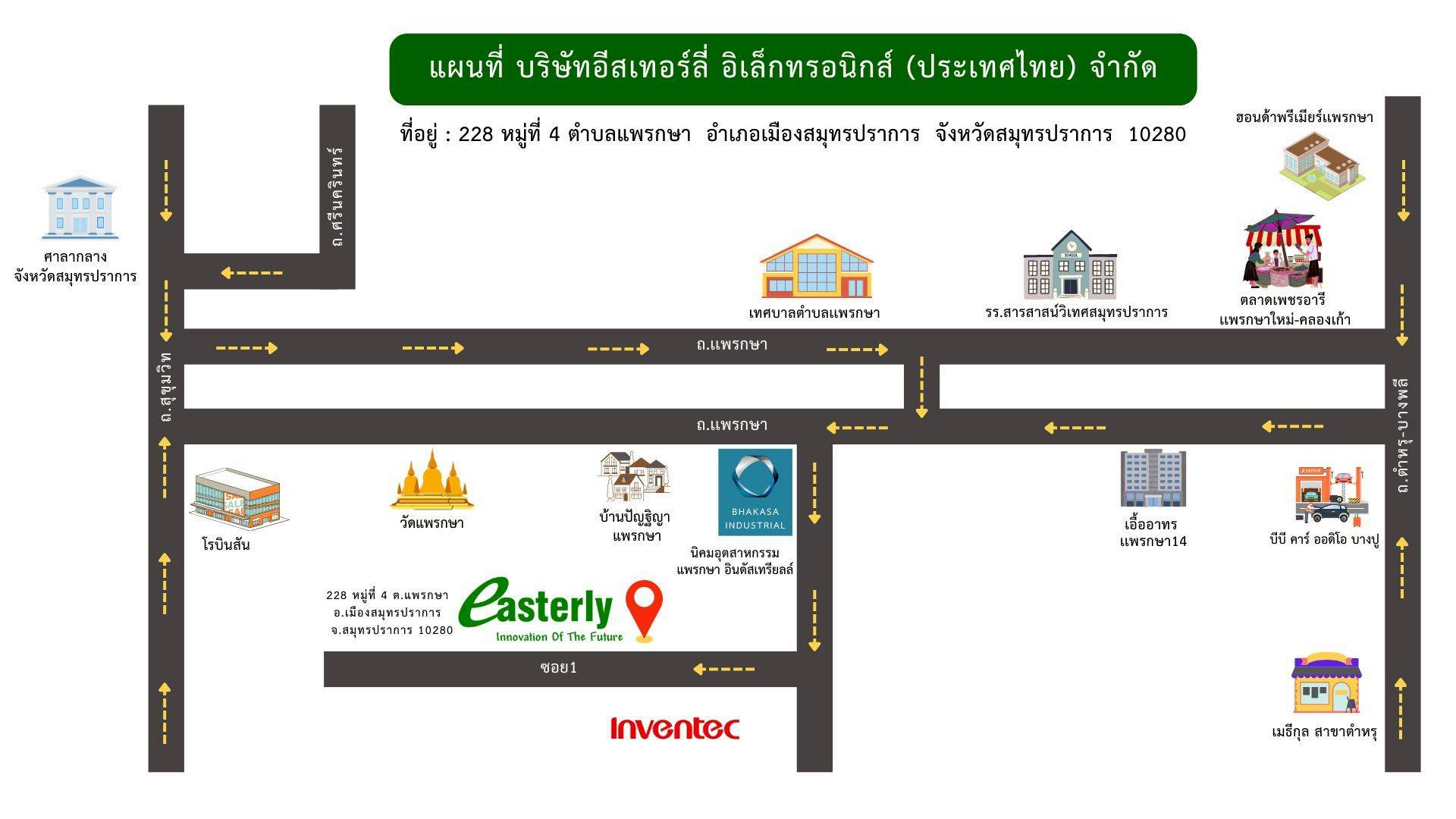บริษัท อีสเทอร์ลี่ อิเล็กทรอนิกส์ (ประเทศไทย)จํากัด 228 หมู่ที่4 ถ. แพรกษา ตำบล แพรกษา อำเภอเมืองสมุทรปราการ สมุทรปราการ 10280 ตำบลแพรกษา อำเภอเมืองสมุทรปราการ จังหวัดสมุทรปราการ 10280 ประเทศไทย