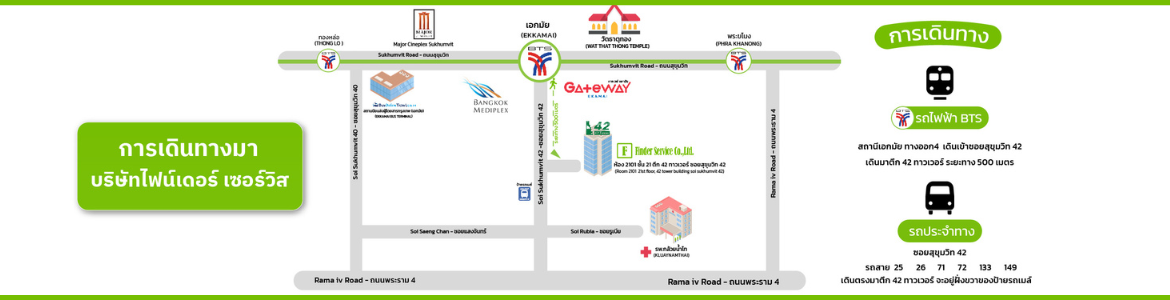 การเดินทางเพิ่มเติม : นั่ง BTS มาลงที่สถานีเอกมัย หลังจากนั้นเดินออกจาก BTS ทางออกที่ 4 เข้ามาในซอยสุขุมวิท 42 เข้ามาประมาณ 500 เมตรจะผ่านห้าง Gateway เอกมัยและจะถึงอาคาร 42 Tower กดลิฟท์มาที่ชั้น 21 บริษัทจะอยู่ที่ห้อง 2101