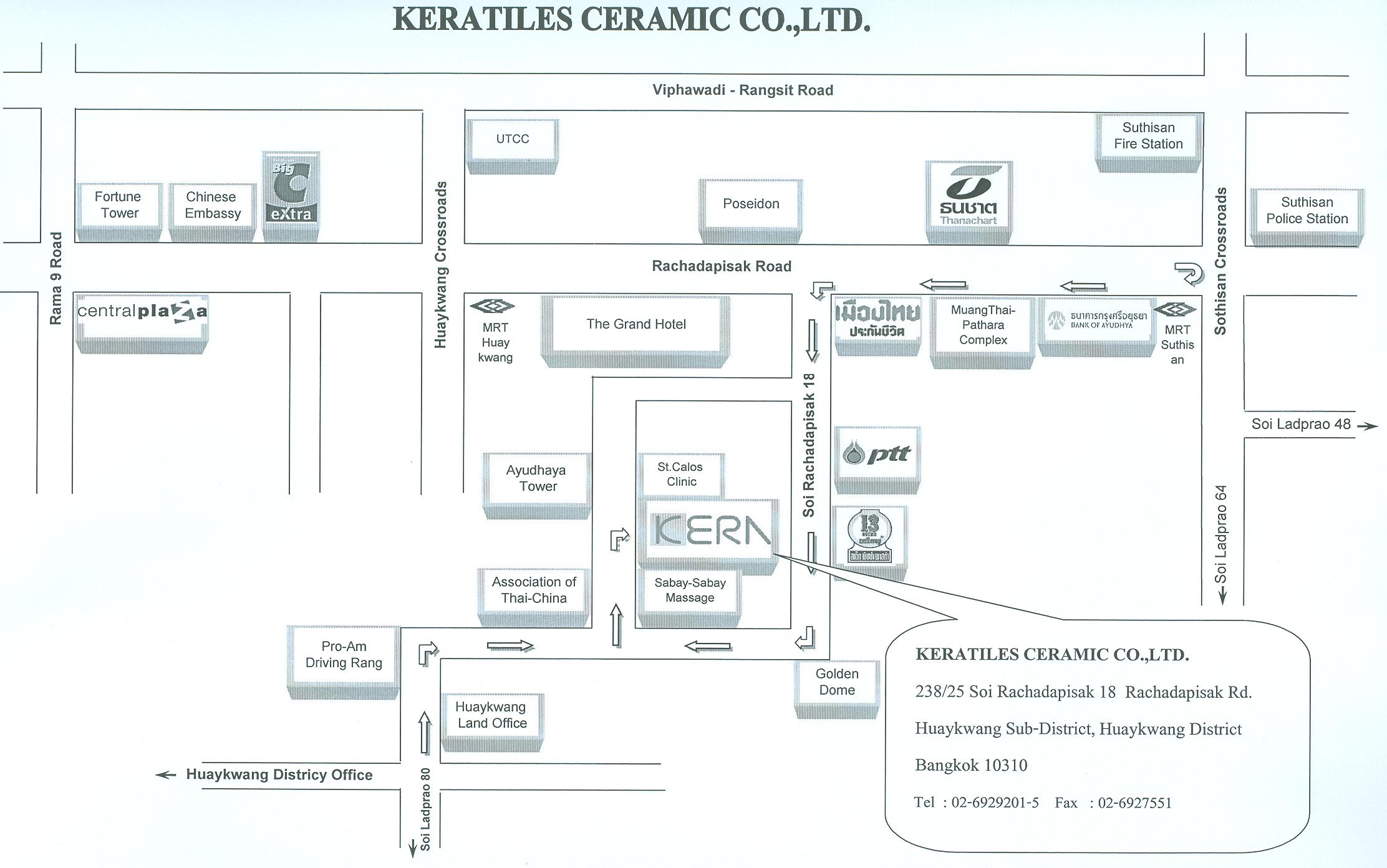 บริษัท เคอร่าไทล์ เซรามิก จำกัด 238/25 ซอยรัชดาภิเษก 18 ถนนรัชดาภิเษก (เวลาทำการ 08.30-17.30 จันทร์ - วันเสาร์) แขวงห้วยขวาง เขตห้วยขวาง จังหวัดกรุงเทพมหานคร 10310 ประเทศไทย