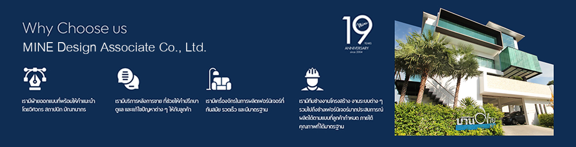 บริษัท มายดีไซน์ แอสโซสิเอต จํากัด (MINE Design Associate Co.,Ltd.) ดำเนินธุรกิจ แบบ One Stop Service ด้านการออกแบบ รับเหมาก่อสร้าง รีโนเวท อาคารทุกชนิด ไม่ว่าจะเป็น บ้านพักอาศัย เรือนรับรอง อาคารพาณิชย์ อาคารสำนักงาน อพาร์ตเมนต์ คอนโดมิเนียม งานต่อเติม เป็นต้น รวมไปถึงงานด้านการตกแต่งภายใน และงานผลิตเฟอร์นิเจอร์ทุกชนิด ด้วยประสบการณ์ในการทำงานมากกว่า 20 ปี