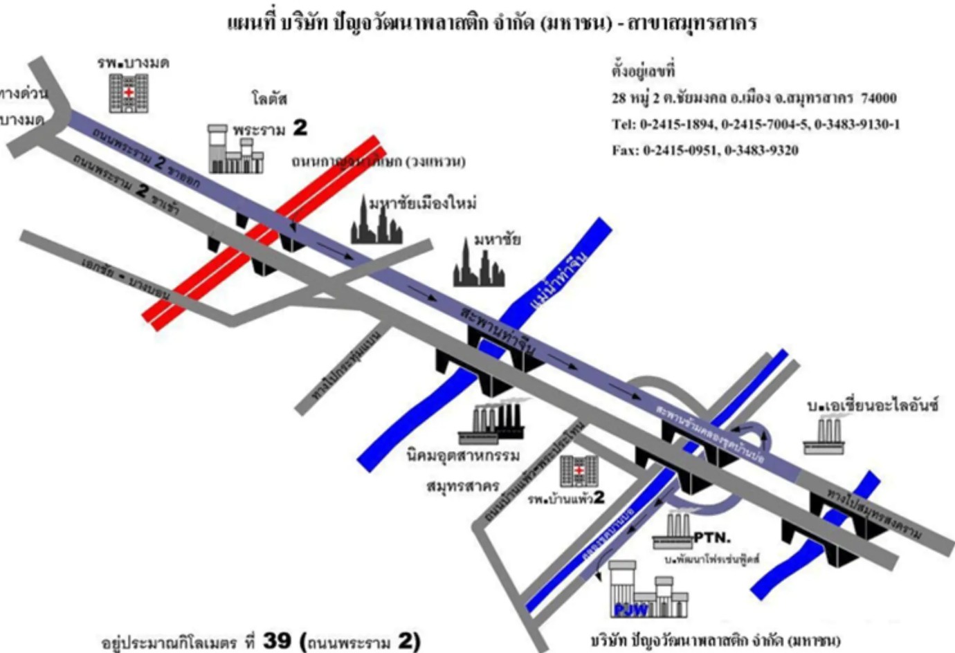 บริษัท ปัญจวัฒนาพลาสติก จำกัด (มหาชน) 28 หมู่ 2 ต.ชัยมงคล สาขา สมุทรสาคร ต.ชัยมงคล อ.เมือง ตำบลชัยมงคล อำเภอเมืองสมุทรสาคร จังหวัดสมุทรสาคร 74000 ประเทศไทย
